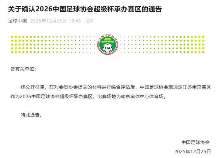 12月25日,中国足球协会发布关于确认2026中国足球协会超级杯承办赛区的通告,明确比赛场地为南京奥体中心体育场。具体如下: