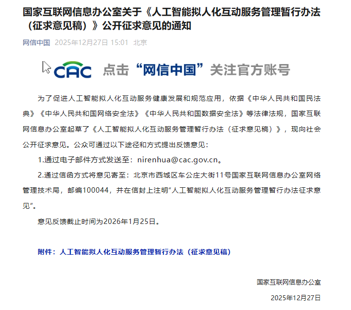 国家互联网信息办公室关于《人工智能拟人化互动服务管理暂行办法(征求意见稿)》公开征求意见的通知