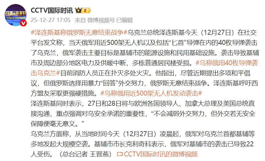 乌克兰总统泽连斯基今天(12月27日)在社交平台发文称,当天俄军用近500架无人机以及包括“匕首”导弹在内的40枚导弹袭击了乌克兰,俄军袭击主要目标是基辅市的能源设施和民用基础设施。袭击导致基辅市及周边部分地区电力及供暖中断,多栋普通居民楼受损。目前消防人员正在扑灭多处火灾。他指出,尽管近期提出多项和平倡议,但俄罗斯选择用暴力“回答”外交努力,俄罗斯无意结束战争。泽连斯基呼吁西方盟友采取更强硬措施。