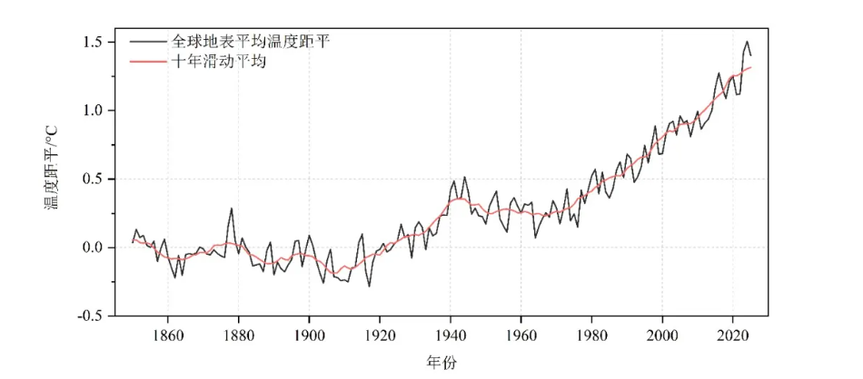 图1 1850~2025年全球地表平均温度距平序列(相对1850-1900年平均值)