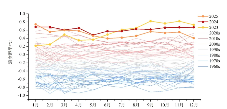 图2 全球地表月平均温度距平(1961年1月至2025年12月,相对于1991-2020年同期平均值)2025年用橙粗线表示,2024年用红粗线表示,2023年用黄粗线表示,其他年代用细线表示,从浅蓝色(1960年代)到浅红色(2020年代)