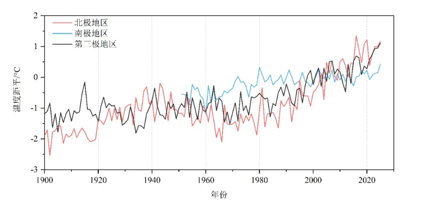 图4 1900-2025年南、北极地区和第三极地区平均温度距平(相对1991-2020年平均值)