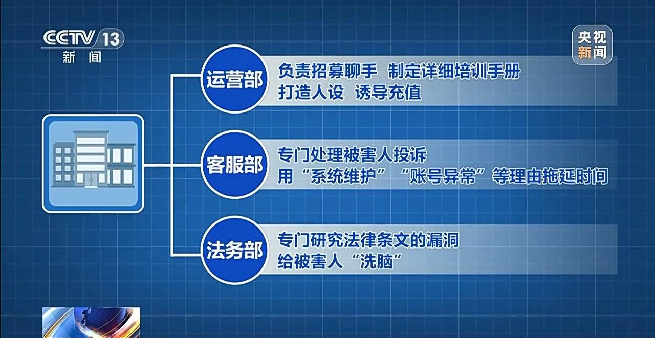 经过又一个月的奋战,专案组依托破解的数据和解析平台,厘清了该团伙公司化运作的架构,其核心成员21人,下设运营、法务、客服等6个部门,运营部负责招募女聊手,制定详细培训手册,打造人设、诱导充值;客服部专门处理被害人投诉,用“系统维护”“账号异常”等理由拖延时间;法务部则专门研究法律条文的漏洞,给被害人“洗脑”。