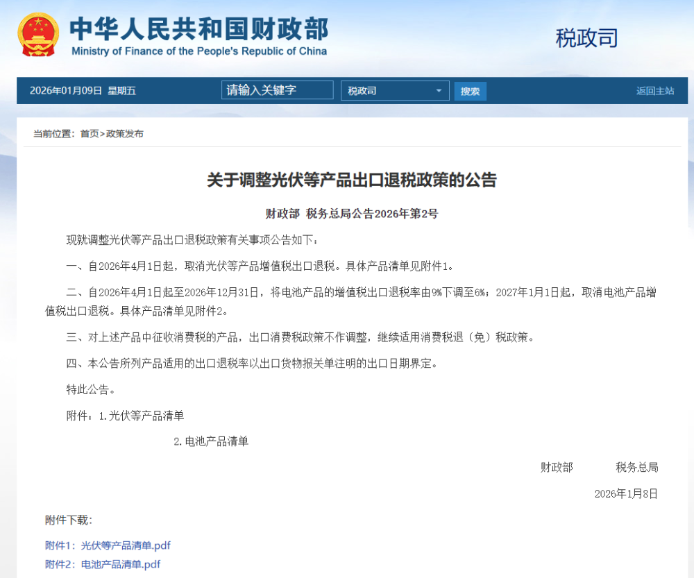 一、自2026年4月1日起,取消光伏等产品增值税出口退税。具体产品清单见附件1。