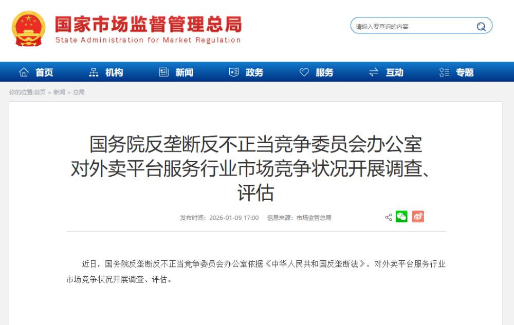 国务院反垄断反不正当竞争委员会办公室对外卖平台服务行业市场竞争状况开展调查、评估 详情