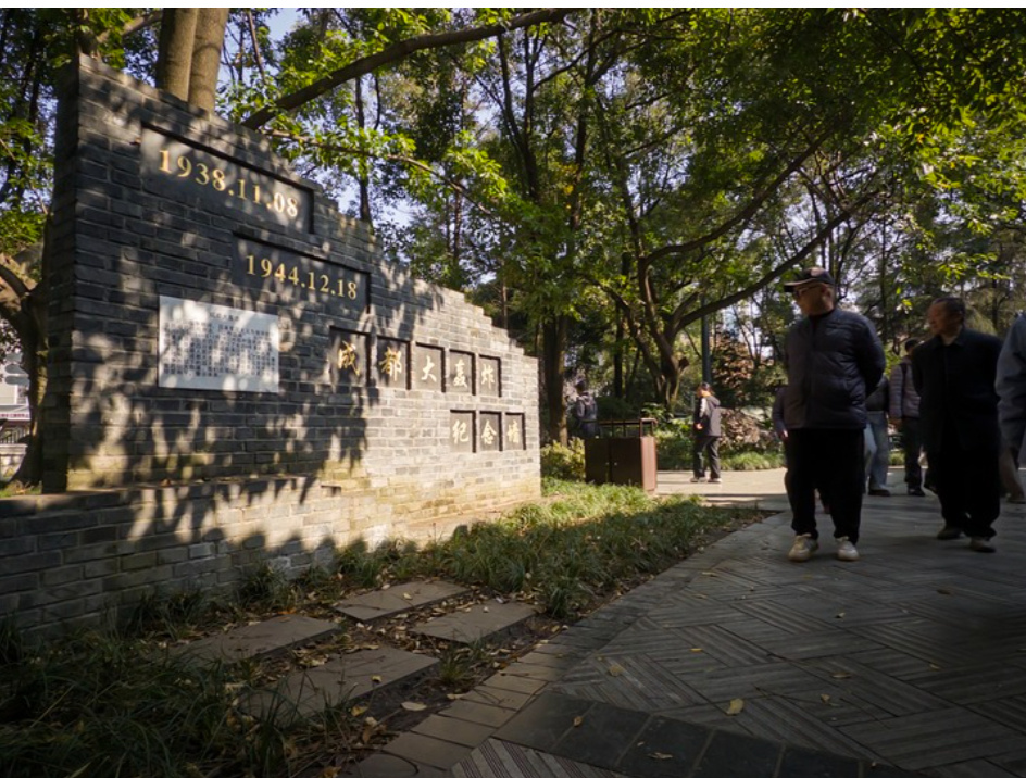 在成都市人民公园,市民驻足观看“成都大轰炸”纪念碑。新华社记者唐文豪摄