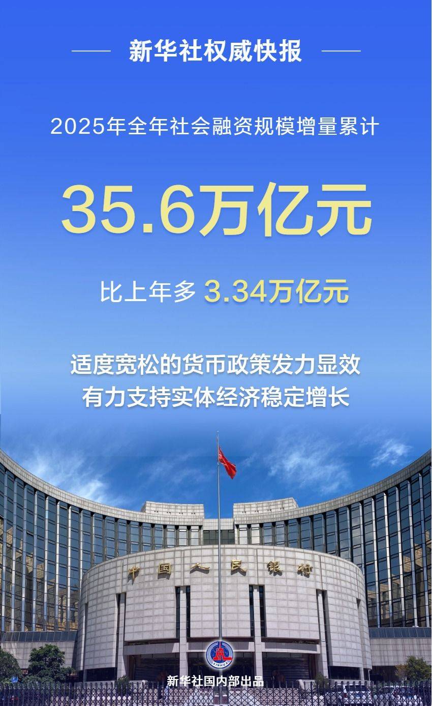 中国人民银行1月15日发布金融统计数据显示,2025年全年社会融资规模增量累计为35.6万亿元,比上年多3.34万亿元。2025年12月末,广义货币(M2)余额340.29万亿元,同比增长8.5%;人民币贷款余额271.91万亿元,同比增长6.4%。适度宽松的货币政策发力显效,有力支持实体经济稳定增长。