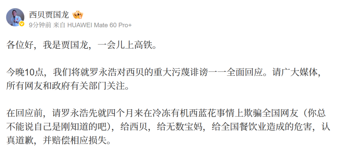 罗永浩表态后,贾国龙最新发声:今晚10点全面回应,请罗永浩认真道歉