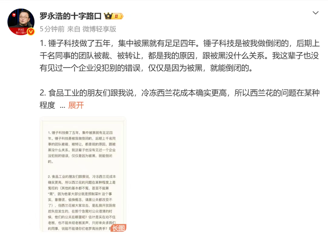 1月16日下午,@罗永浩的十字路口 发布长文回应近日西贝创始人贾国龙的相关言论。罗永浩在文章中称,“锤子科技做了五年,集中被黑就有足足四年。锤子科技是被我做倒闭的,后期上千名同事的团队被裁、被转让,都是我的原因,跟被黑没什么关系。我这辈子也没有见过一个企业没犯别的错误,仅仅是因为被黑,就能倒闭的。”