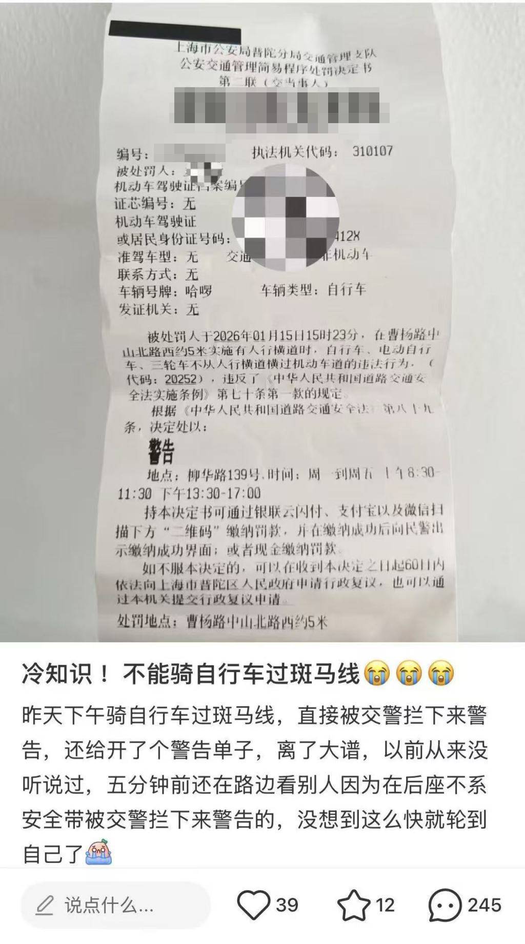 近日,有网友发帖称,自己因骑自行车过斑马线的行为,被交警开具警告罚单。网友晒出的处罚决定书显示,其于2026年1月15日15时23分,在曹杨路中山北路骑自行车过斑马线时,被交警作出警告处罚。