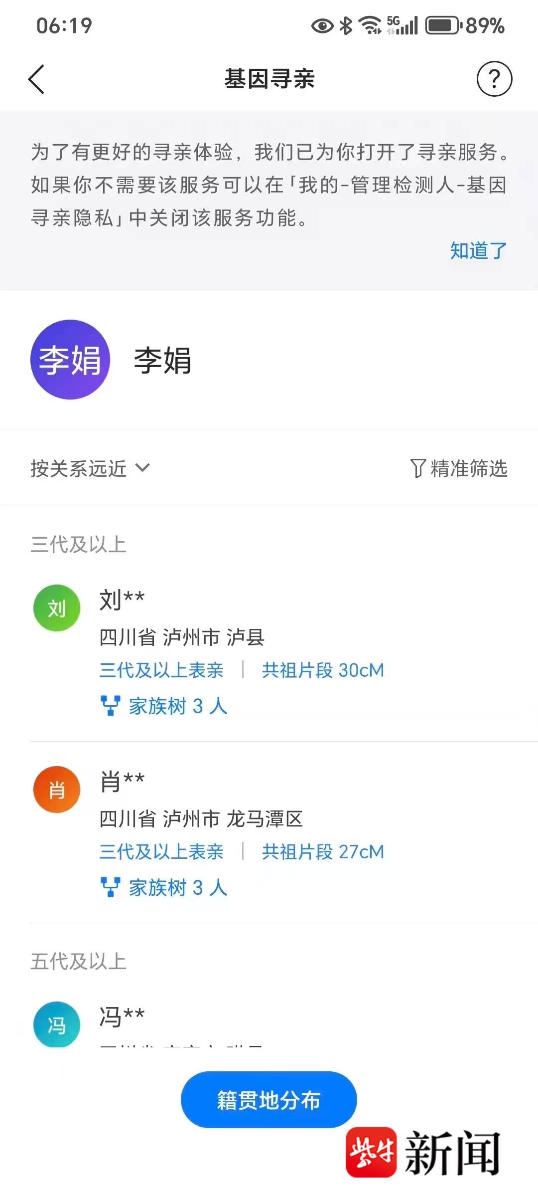12岁那年,李娟曾与母亲通过一次电话,电话中她得知了一个重要信息。她有一个小三岁、名叫乐乐的弟弟。“从那天起,找到妈妈和弟弟就成了我最大的心愿,我总在想,他们会不会也在某个地方惦记着我?”李娟说。为了寻亲,李娟进行了基因检测,检测结果显示她与泸州市龙马潭区的刘氏家族、肖氏家族可能存在亲缘关系。记者注意到,她和四川省泸州市泸县的刘某是三代及以上表亲,共祖片段30cM。