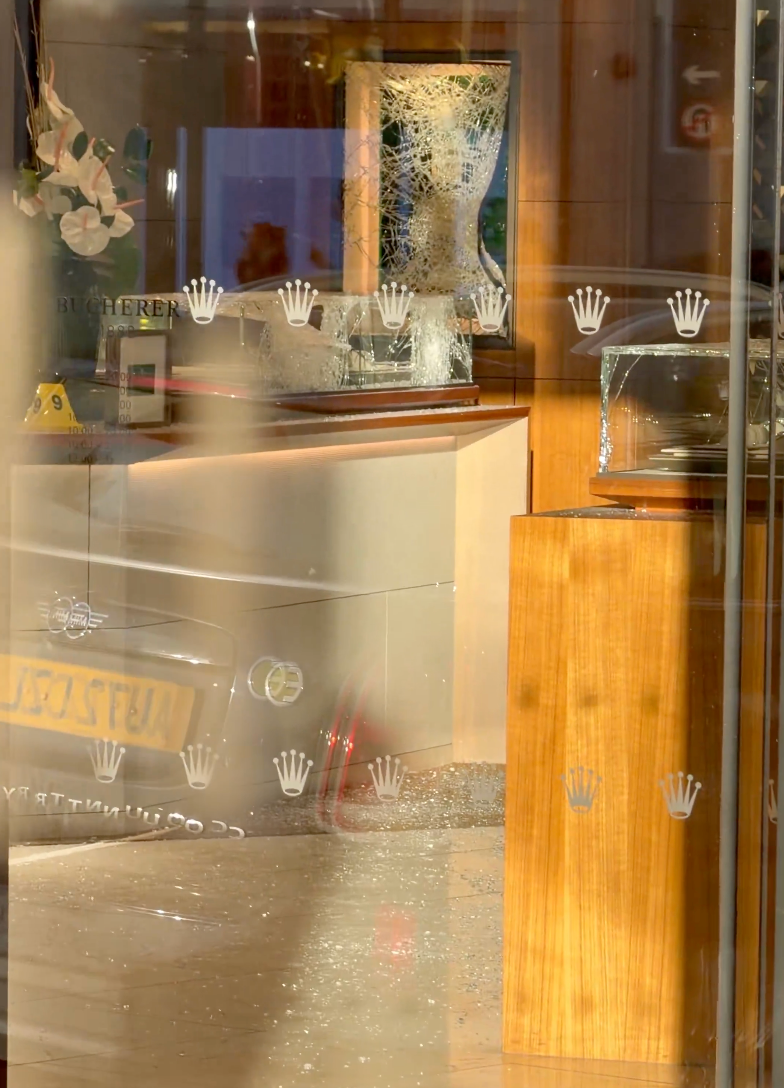 一名在附近奢侈品店工作的保安回忆起当时混乱的场景时仍心有余悸:“起初是一声巨响,听起来像发生了严重的交通事故。紧接着就是尖叫声和四处逃散的人群,场面一度失控。”直到他看到一辆摩托车直接冲进了劳力士店的大门,才意识到这是一场“冲撞式”抢劫。