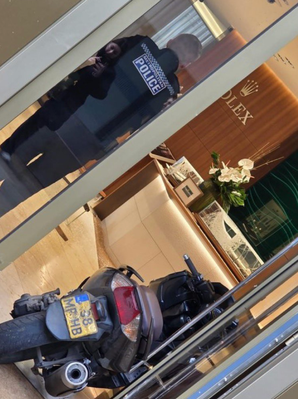 一辆摩托车冲进被抢劳力士店