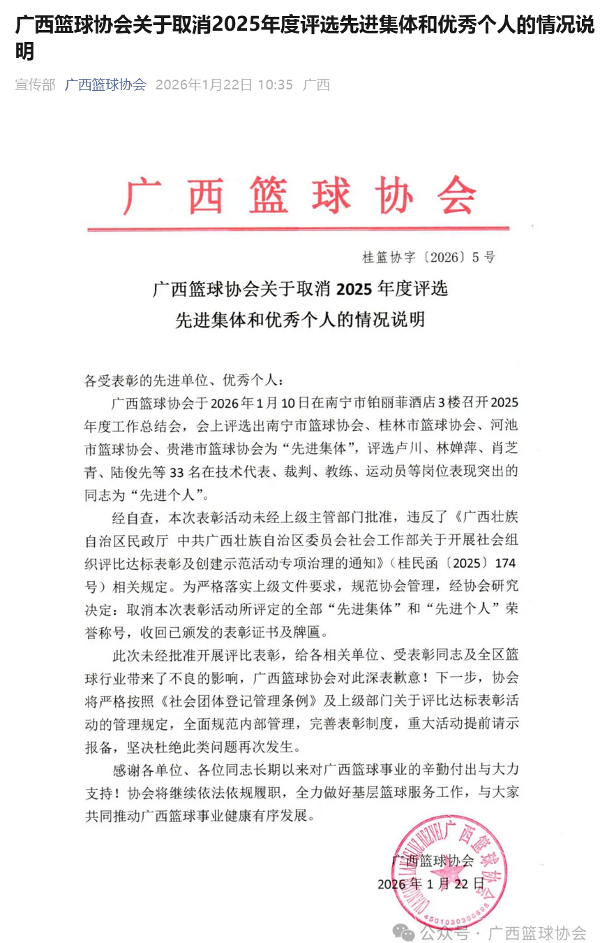 1月22日,广西篮球协会发布关于取消2025年度评选先进集体和优秀个人的情况说明: