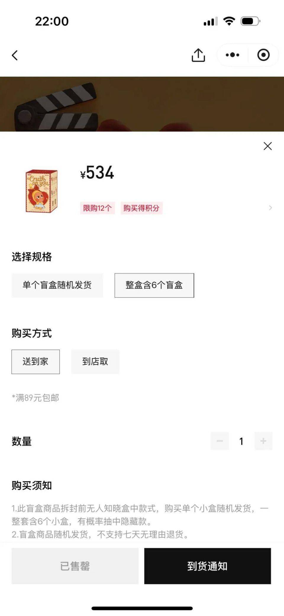 记者于开售前提前进入泡泡玛特小程序,做好购买准备,22点整点击购买时,页面已显示“售罄”。反复尝试后依然无法成功下单。