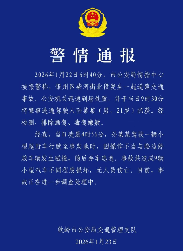 记者注意到,铁岭市公安局交通管理支队2026年1月23日就此发布了警情通报。通报称,2026年1月22日6时40分,市公安局情指中心接报警称,银州区柴河街北段发生一起道路交通事故。公安机关迅速到场处置,并于当日9时30分将肇事逃逸驾驶人孙某某(男,21岁)抓获。经检测,排除酒驾、毒驾嫌疑。
