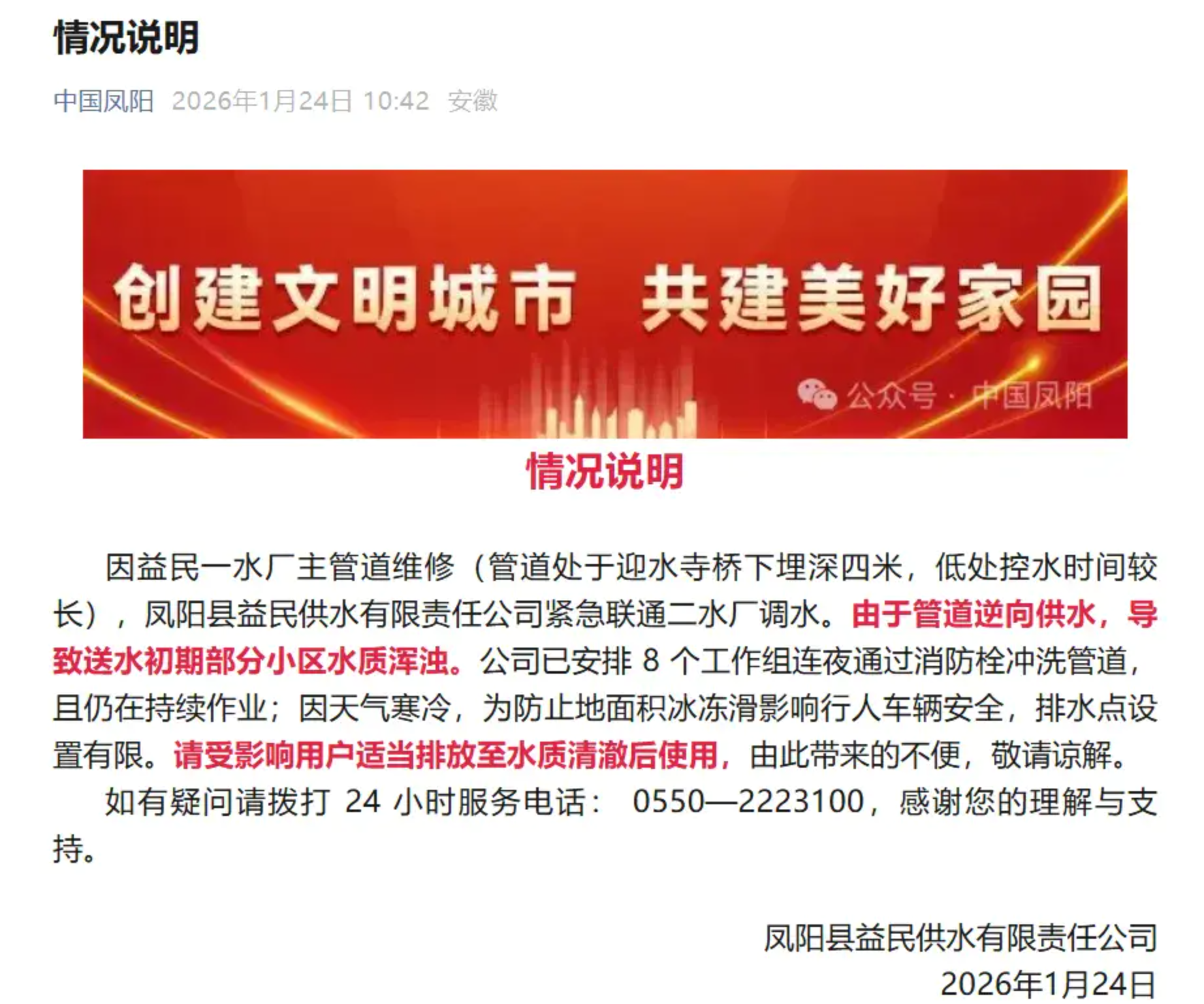 1月24日,安徽凤阳县益民供水有限责任公司发布情况说明: