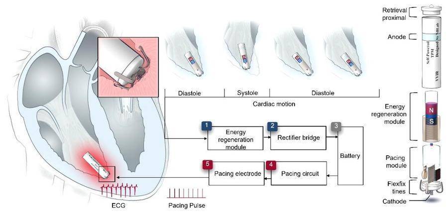 这款起搏器的核心创新是集成了高效能量再生模块:它能通过电磁感应技术,从心脏自身的跳动中捕获动能,并将其转化为电能。测试显示,其输出功率已突破起搏器终身运行的临界能量阈值,可稳定驱动起搏电路,实现对心脏节律的精准调控。同时,器件采用高度微型化设计,兼具优异的生物相容性与血液相容性,支持经导管微创植入,大幅降低手术创伤。