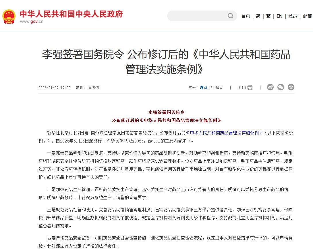 23年来首次全面修订 《药品管理法实施条例》将于5月15日施行 详情