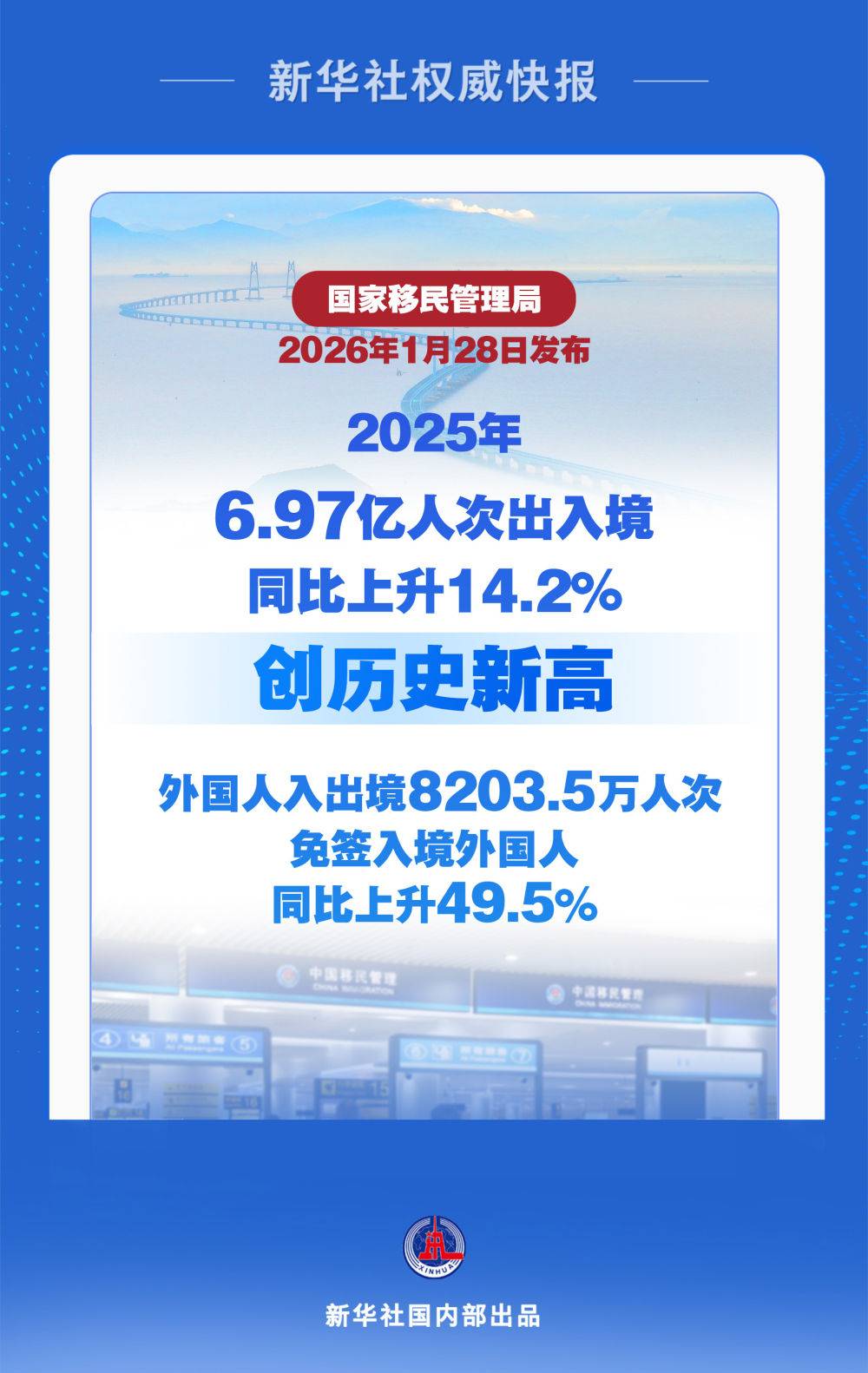 记者1月28日从国家移民管理局新闻发布会获悉,2025年,全国移民管理机构共查验出入境人员6.97亿人次,同比上升14.2%,创历史新高。其中,内地(大陆)居民3.35亿人次、港澳台居民2.79亿人次,同比分别上升15.1%、10.1%;外国人8203.5万人次、同比上升26.4%,免签入境外国人3008万人次、占入境外国人73.1%、同比上升49.5%。