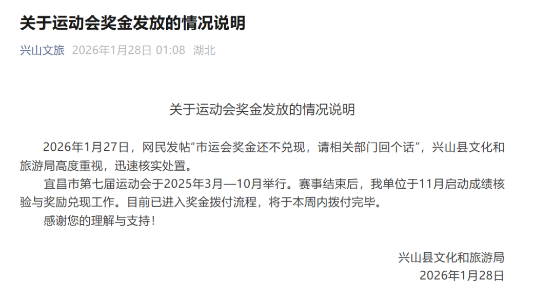 1月28日,扬子晚报/紫牛新闻记者注意到,湖北宜昌兴山县文化和旅游局发布关于运动会奖金发放的情况说明称,2026年1月27日,网民发帖“市运会奖金还不兑现,请相关部门回个话”,兴山县文化和旅游局高度重视,迅速核实处置。”宜昌市第七届运动会于2025年3月—10月举行。赛事结束后,我单位于11月启动成绩核验与奖励兑现工作。目前已进入奖金拨付流程,将于本周内拨付完毕。