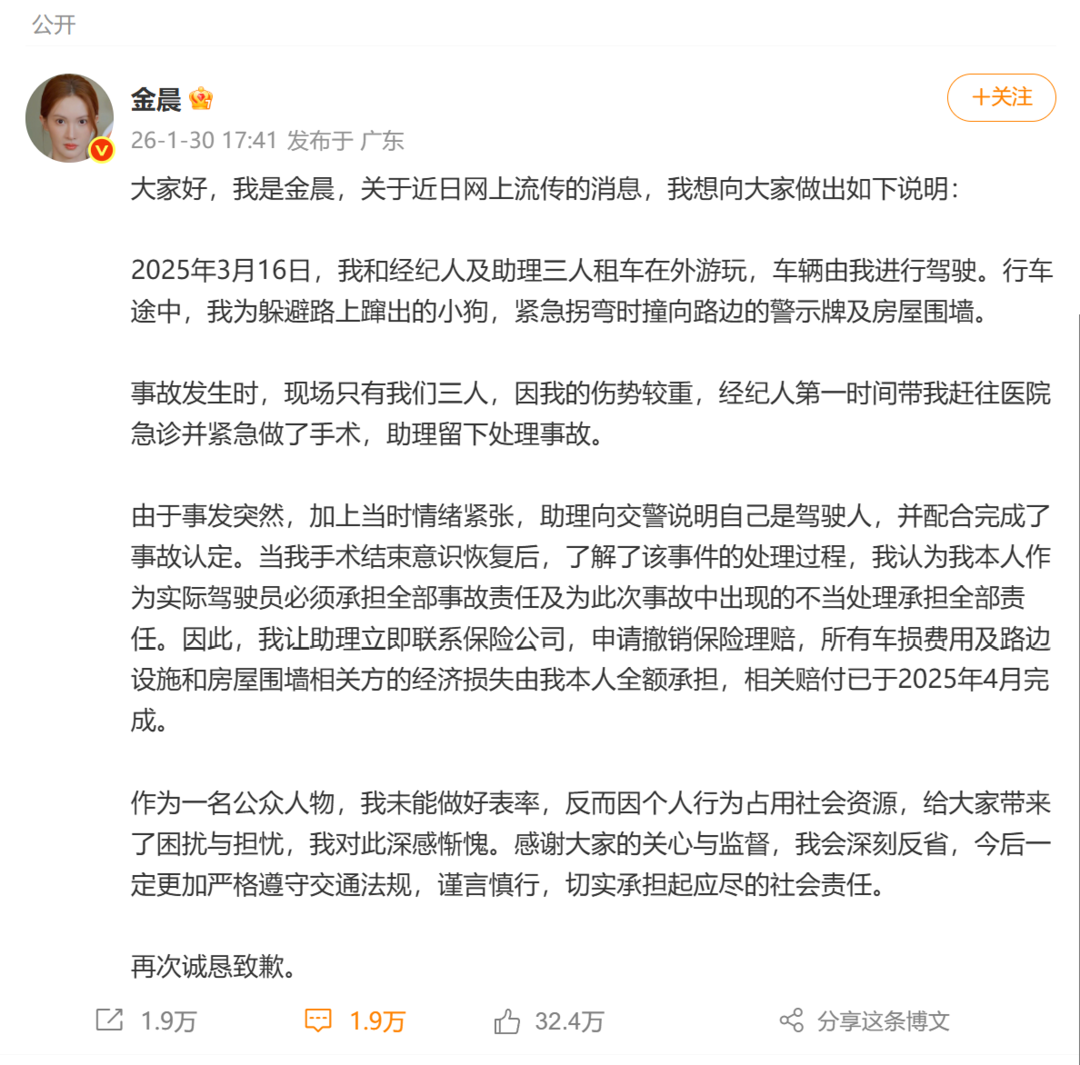 金晨回应“肇事顶包”传闻并致歉,警方通报:助理曾谎称驾驶员,未构成骗保 详情