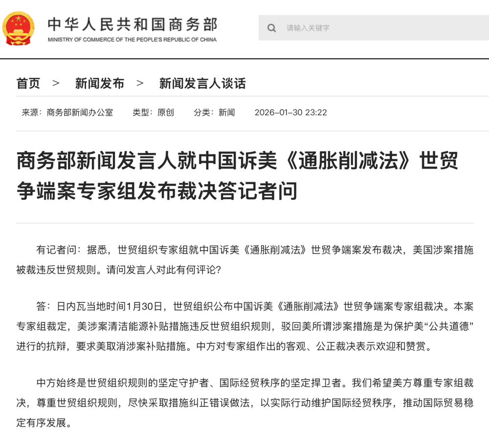 答:日内瓦当地时间1月30日,世贸组织公布中国诉美《通胀削减法》世贸争端案专家组裁决。本案专家组裁定,美涉案清洁能源补贴措施违反世贸组织规则,驳回美所谓涉案措施是为保护美“公共道德”进行的抗辩,要求美取消涉案补贴措施。中方对专家组作出的客观、公正裁决表示欢迎和赞赏。