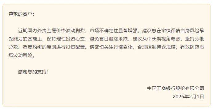 国内外贵金属价格剧烈波动,2月1日,工商银行再次紧急发布风险提示。