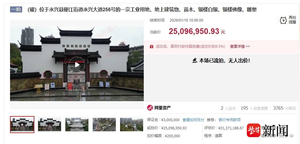 其中,土地评估价为9181200元、地上建筑物评估价为9426556元、苗木评估价为309566元、银楼白银评估价为12047000元,此外,银楼佛像、雕塑评估价为406866.67元。所有资产整体评估价3137余万元,起拍价2509余万元,保证金300万元。该次拍卖于1月16日结束,有两人报名,但最终因无人出价流拍。
