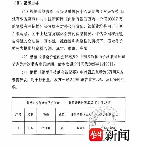 一份价格评估报告书内容显示,根据永兴县融媒体中心发表的《永兴银楼:此地有银五萬两》与中国新闻网《此地有银五万两,价值1000多万的银楼有些招摇》等媒体在对外公开宣传,银楼建筑是由5万两白银构成。根据《银楼价值的会议纪要》,银价取价时间为2025年1月23日,对银总重量为5万两未提异议,一致认为纯银含量为70%,即1.75吨纯银,评估纯银单价为6.884元/克。