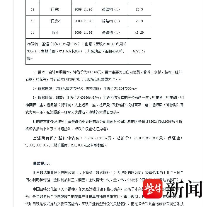 据了解,拍卖标的物中,最引人关注的是一座银楼,也就是“永兴银楼”。拍卖资料显示,中国白银文化馆(天下银楼)作为鑫达银业旗下核心资产,是当地依托“中国银都”的雄厚产业根基与独特白银文化,重点规划、倾力打造的文旅标杆项目。