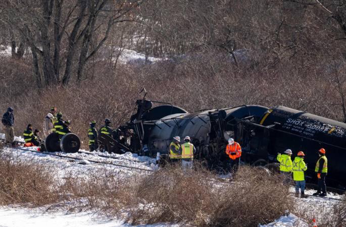 美国东部时间2月5日上午,一列载有危险化学品的货运列车在康涅狄格州曼斯菲尔德镇脱轨,部分车厢滑入附近一条河中。