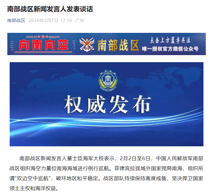 南部战区新闻发言人翟士臣海军大校表示,2月2日至6日,中国人民解放军南部战区组织海空力量位南海海域进行例行巡航。菲律宾拉拢域外国家搅局南海,组织所谓“双边空中巡航”,破坏地区和平稳定。战区部队持续保持高度戒备,坚决捍卫国家领土主权和海洋权益。