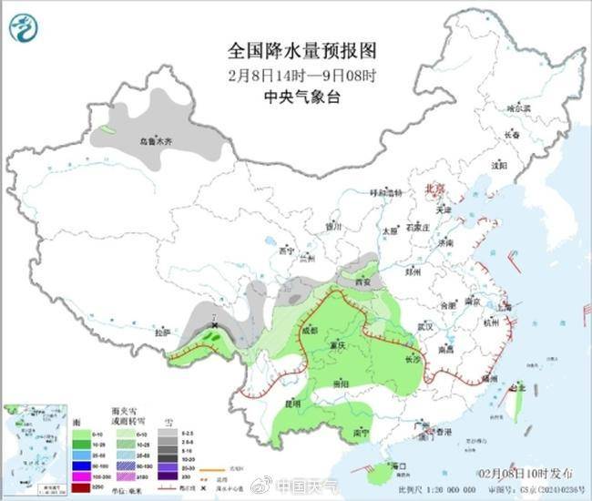 今后三天(2月8日至10日),西藏东南部、西南地区东部、江汉、江南、江淮等地有小到中雨,湖北、湖南北部、江苏北部等地将出现雨转雪或雨夹雪,贵州、湖南北部、湖北等局地有冻雨;新疆北部、西藏东部、川西高原、甘肃南部、陕西南部、山西南部、山东等地部分地区有小雪或雨夹雪,西藏东南部局地有中到大雪。