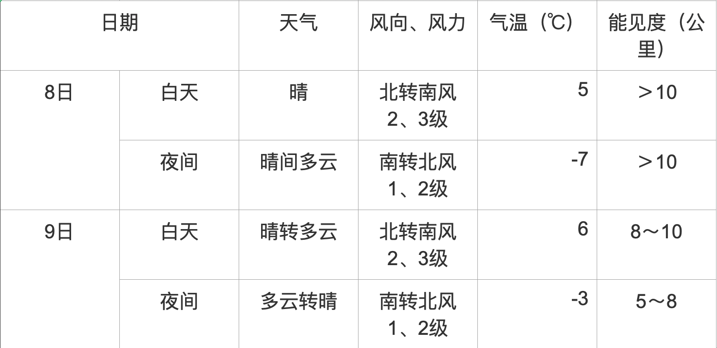 8日至9日,北京地区以晴到多云为主,9日夜间大气扩散条件转差,最低能见度在5~8公里。期间气温逐步回升,白天最高气温5~6℃,夜间最低气温-7~-3℃。具体天气预报如下: