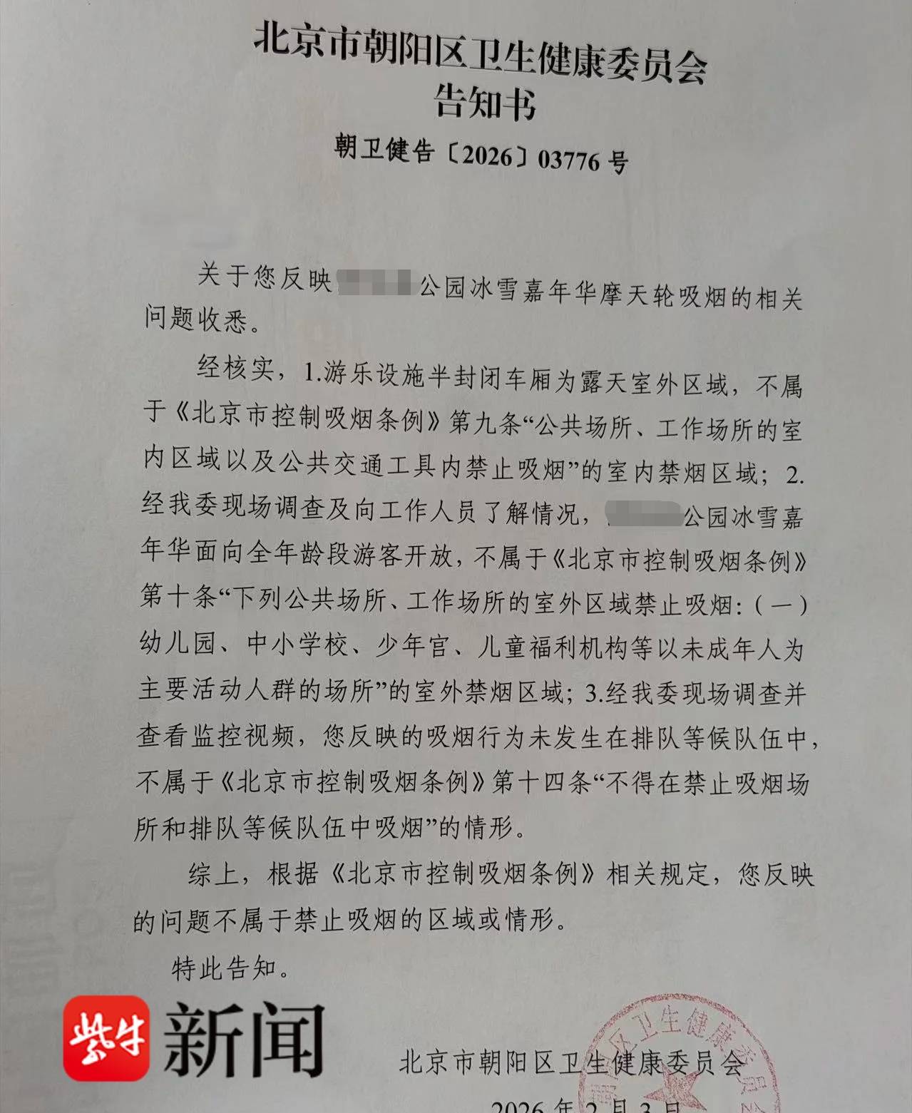 记者在该网友发布的帖子中看到,在摩天轮一节没有完全封闭的厢体内,一名男子正在“吞云吐雾”,十分惬意。“在公园里的游乐设施上,有小孩子的地方,原来可以抽烟!”在发出这一感慨的同时,该网友也随文贴出了一份来自北京市朝阳区卫健委员发送的告知书。告知书中称,对于反映冰雪嘉年华摩天轮吸烟的相关问题收悉。经核实,1.游乐设施半封闭车厢为露天室外区域,不属于《北京市控制吸烟条例》第九条“公共场所、工作场所的室内区域以及公共交通工具内禁止吸烟”的室内禁烟区域;2.经我委现场调查及向工作人员了解情况,该公园冰雪嘉年华面向全年龄段游客开放,不属于《北京市控制吸烟条例》第十条“下列公共场所、工作场所的室外区域禁止吸烟:(一)幼儿园、中小学校、少年宫、儿童福利机构等以未成年人为主要活动人群的场所”的室外禁烟区域;3.经我委现场调查并查看监控视频,您反映的吸烟行为未发生在排队等候队伍中,不属于《北京市控制吸烟条例》第十四条“不得在禁止吸烟场所和排队等候队伍中吸烟”的情形。综上,根据《北京市控制吸烟条例》相关规定,您反映的问题不属于禁止吸烟的区域或情形。
