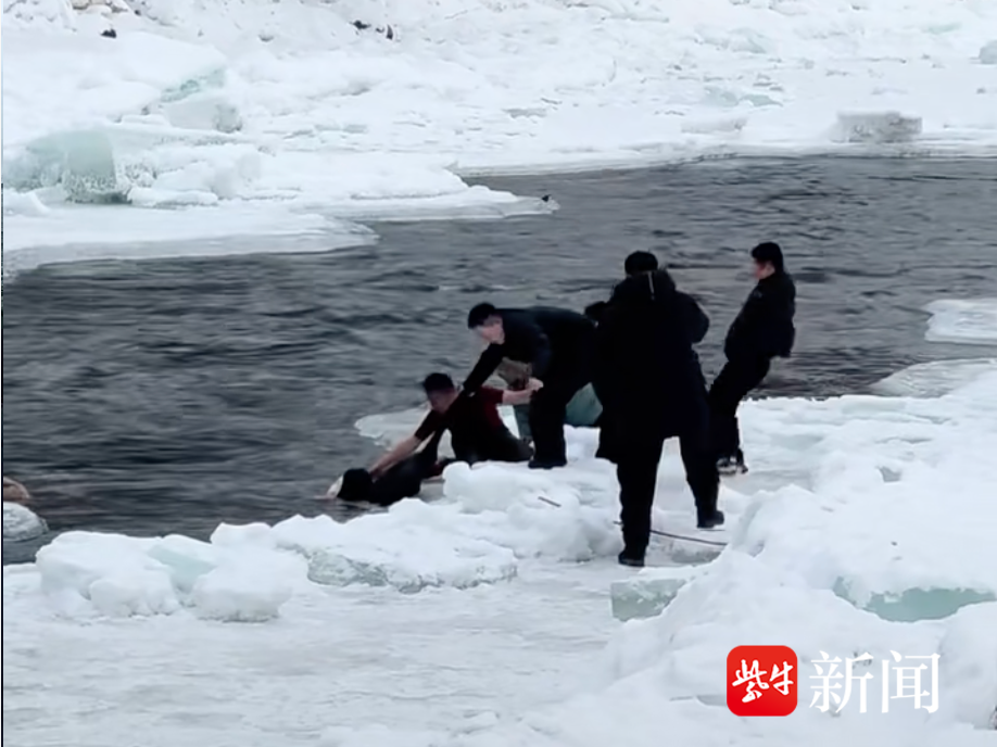 2月10日,新疆阿勒泰地区布尔津县境内喀纳斯河发生惊险一幕,一大一小两名游客落入冰河,随着河水向下游漂去,还不时撞到浮冰被卷入水下。危急关头现场多人伸出援手,其中一位身穿红色短袖的男子飞奔拽住孩子,随后又在众人合力下将另一名女子救下。