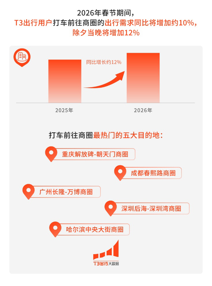 此外,春节期间亲朋好友欢聚一堂,也增加了商圈出行热度。数据预测,春节期间,用户打车前往商圈的出行需求同比将增加约10%,其中除夕当晚将增加12%。“重庆解放碑-朝天门商圈、成都春熙路商圈、广州长隆-万博商圈、深圳后海-深圳湾商圈以及哈尔滨中央大街商圈是春节假期出行需求量Top5商圈。”上述负责人介绍。