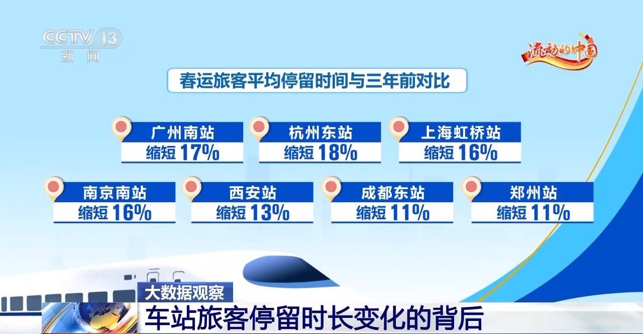 而旅客停留时间缩短的现象不只在广州南站,大数据发现,在比较繁忙的几个车站,旅客平均停留时间也都比三年前的春运同期缩短了10%以上。