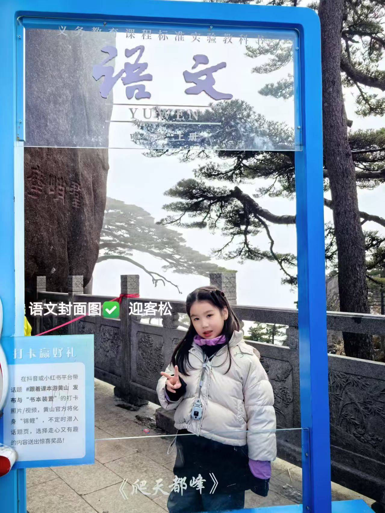 那天天都峰没有开放,但小萌在黄山迎客松旁,和景区设置的语文书封面打卡牌合了影。