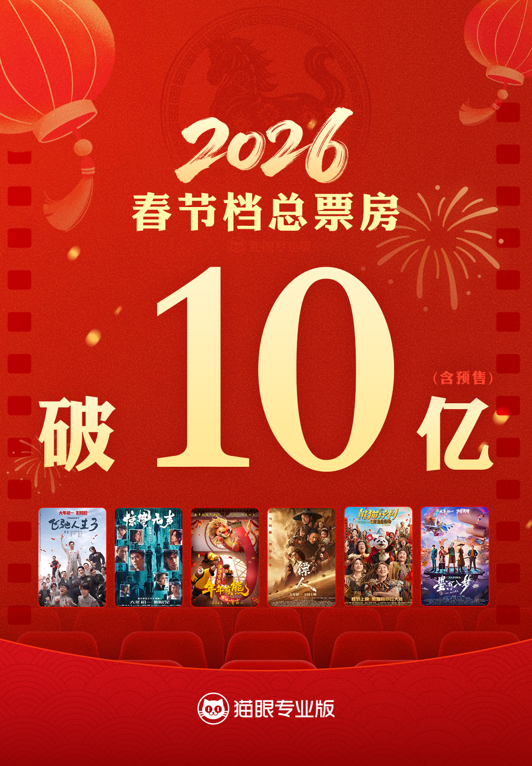据猫眼专业版数据,2026年春节档档期总票房(含预售)破10亿,《飞驰人生3》暂列春节档票房榜首位,档期票房全国登顶!《惊蛰无声》《熊出没·年年有熊》分列二三位。