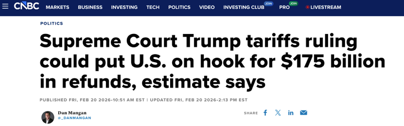 更值得注意的是,从近两天动作看,白宫的核心优先级并不是“尽快把钱退回去”,而是“尽快把关税工具续上”。白宫一方面通过行政令,终止依据IEEPA加征的额外从价税,另一方面又迅速依《1974年贸易法》第一百二十二条祭出为期150天的临时全球15%关税,同时加大利用301条甚至232条等传统工具,继续搭建新的关税墙。这套动作释放的信号十分明确:关税杠杆要继续用,至于已经收来的税款怎么退、退多少,姑且交给诉讼和程序去磨。换句话说,即便法院逼着政府退钱,白宫也在试图通过新一轮、基于其他法律授权的关税,把现金流尽可能补回来。