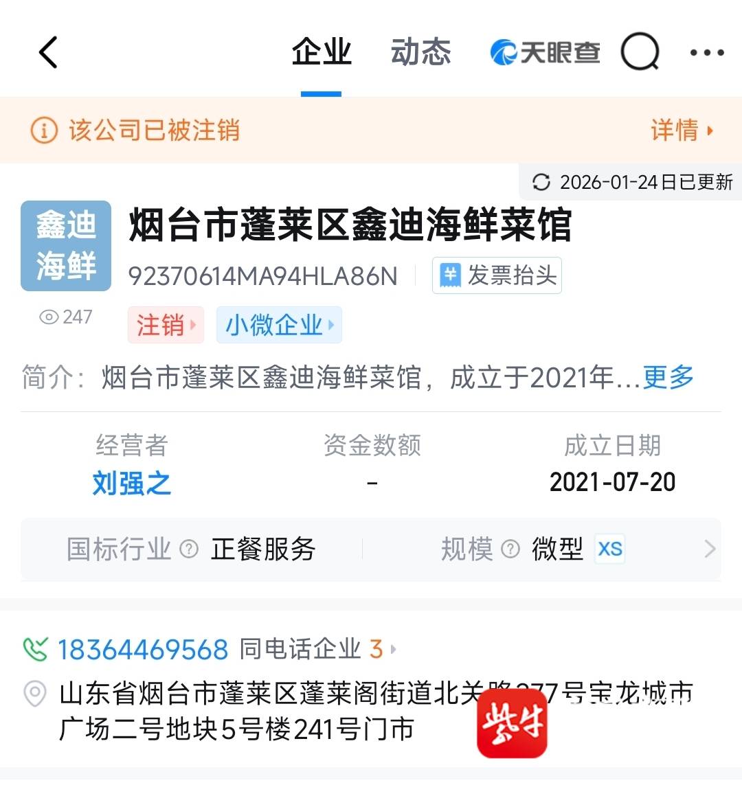 记者曾联系该酒楼及当地多个部门,当地市场监管部门表示已在调查取证。之后当地反馈,市监局立案调查后,于1月16日吊销了 “老蓬莱酒楼” 的营业执照。天眼查信息显示,“鑫迪海鲜菜馆” 的登记状态为 “注销”。