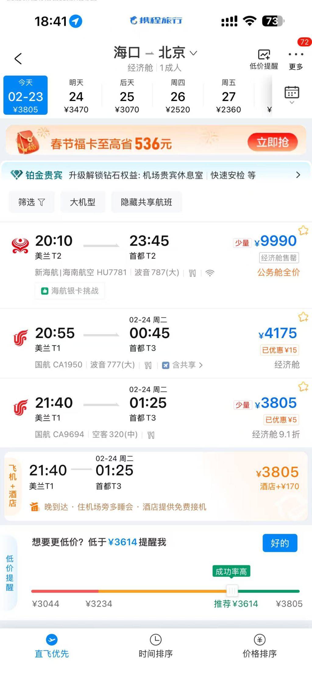 春节假期最后一天,海南迎来春运返程客流高峰,当日从热门旅行目的地海口、三亚等城市飞往北京、上海的航班价格逼近万元。