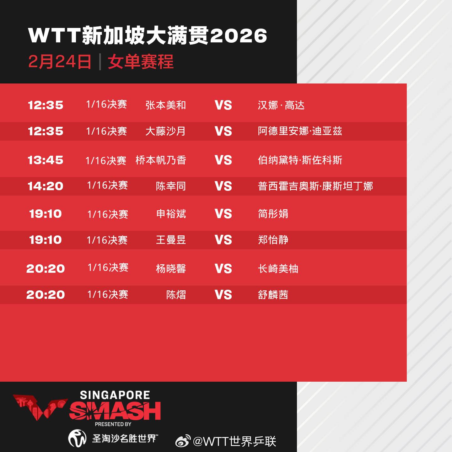 24日,2026年WTT新加坡大满贯进入正赛第三天,林诗栋、王楚钦、王曼昱、蒯曼等出场。具体赛程如下: