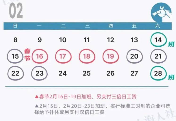 法定节假日为2月16日(除夕)至19日(初三),根据劳动法和《工资支付暂行规定》,用人单位安排劳动者在这些天加班的,应按照不低于劳动合同规定的劳动者本人日或小时工资标准的300%支付劳动者工资,且不能以补休替代。