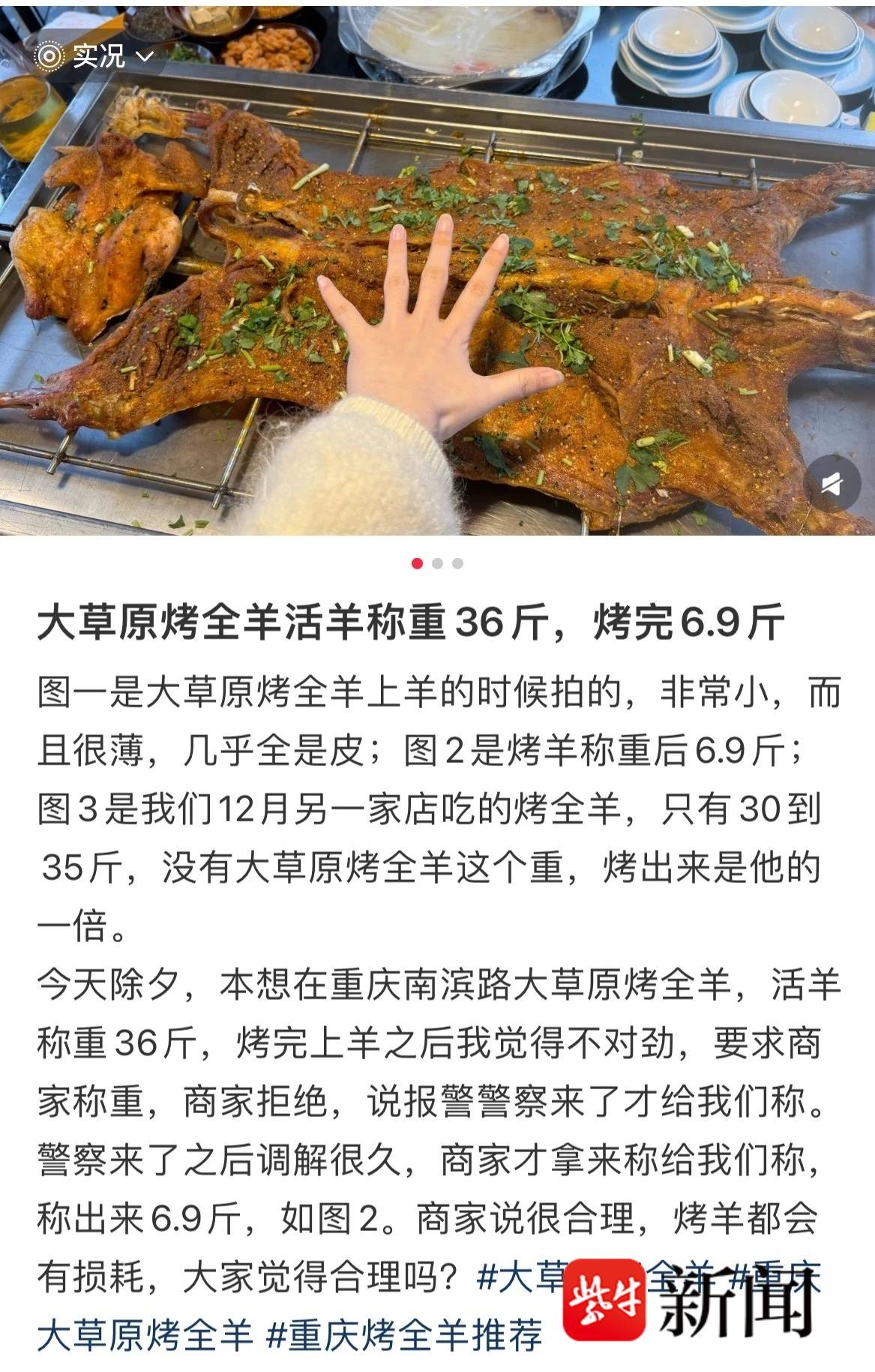 据该网友描述,除夕在重庆南滨路大草原烤全羊就餐,本想开开心心吃个烤全羊,结果遭遇了离谱消费陷阱。该网友称,活羊称重36斤,烤完上羊时肉眼可见的小,几乎全是皮,6个人根本不够吃。在要求称重时被商家直接拒绝,直到警察到场才拖延称重,结果只有6.9斤。商家还声称“烤羊损耗正常”,但该网友称为此咨询了多家烤全羊店,36斤活羊正常烤完至少15斤,这家直接少了一半多。
