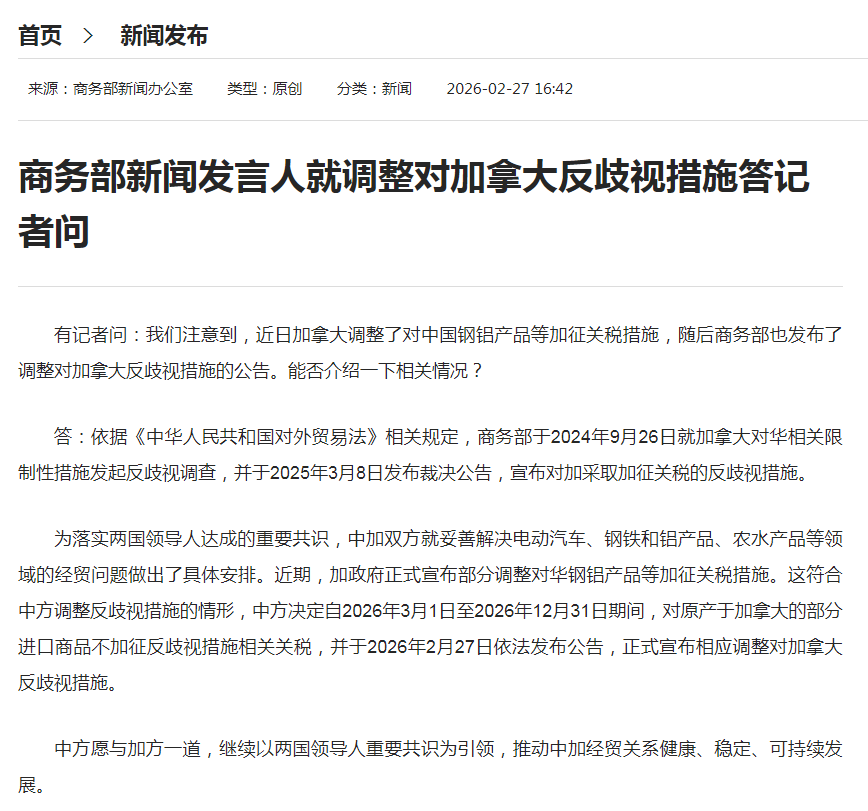 为落实两国领导人达成的重要共识,中加双方就妥善解决电动汽车、钢铁和铝产品、农水产品等领域的经贸问题做出了具体安排。近期,加政府正式宣布部分调整对华钢铝产品等加征关税措施。这符合中方调整反歧视措施的情形,中方决定自2026年3月1日至2026年12月31日期间,对原产于加拿大的部分进口商品不加征反歧视措施相关关税,并于2026年2月27日依法发布公告,正式宣布相应调整对加拿大反歧视措施。