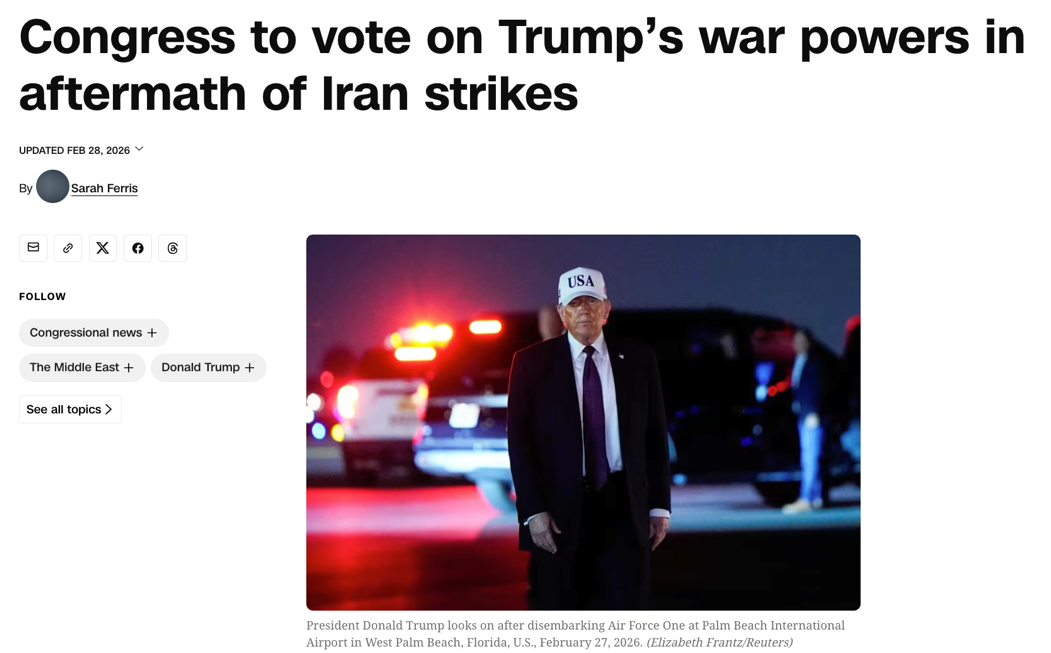 此次争议的直接背景,是特朗普政府对伊朗采取军事打击未事先获得国会明确授权。这一做法迅速引发国会不满,也将一个长期存在却反复被挑战的问题重新推到台前:总统是否可以在未获国会同意的情况下,将国家带入军事冲突。