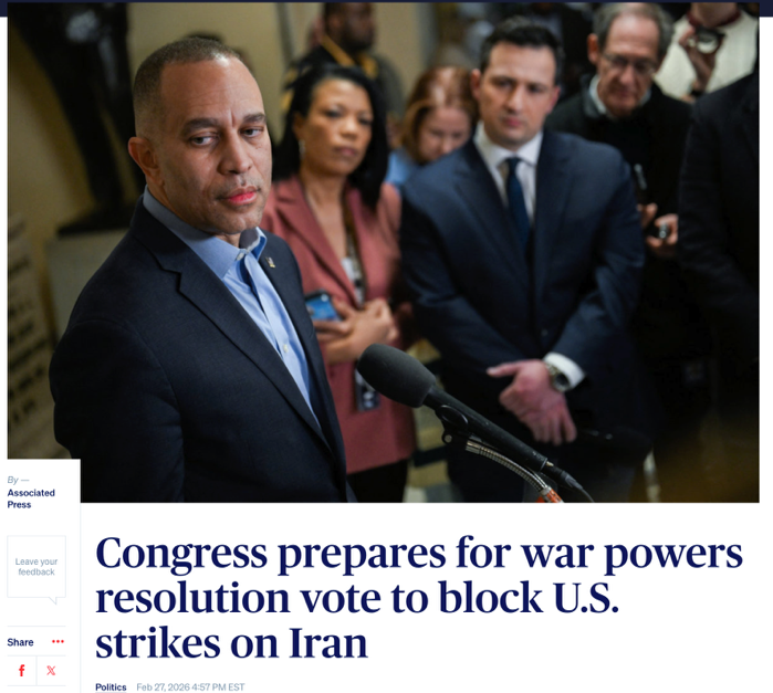 △美国国家公共广播电台报道,众院民主党领袖杰弗里斯表示,将争取本周就“战争权力决议”进行投票。